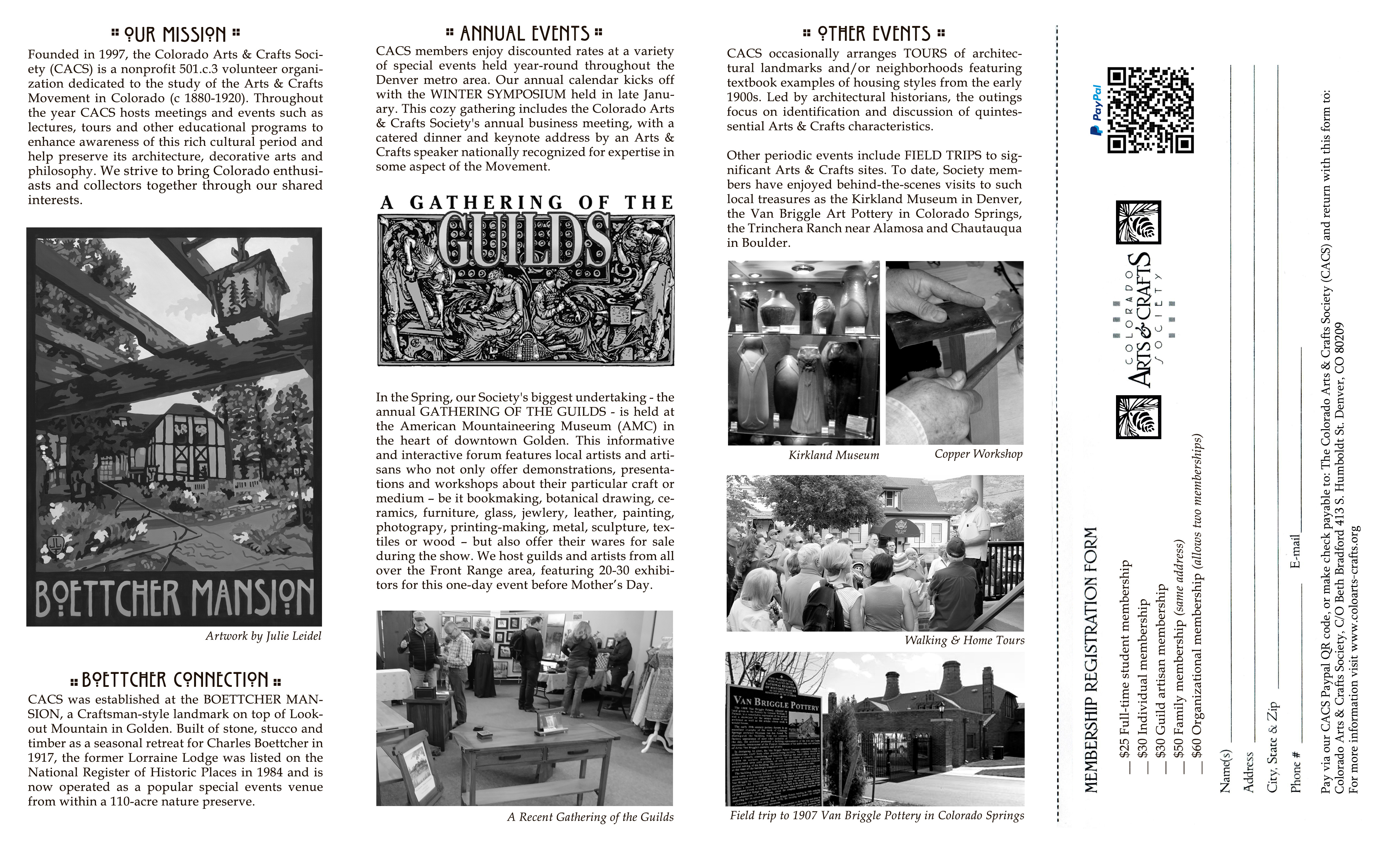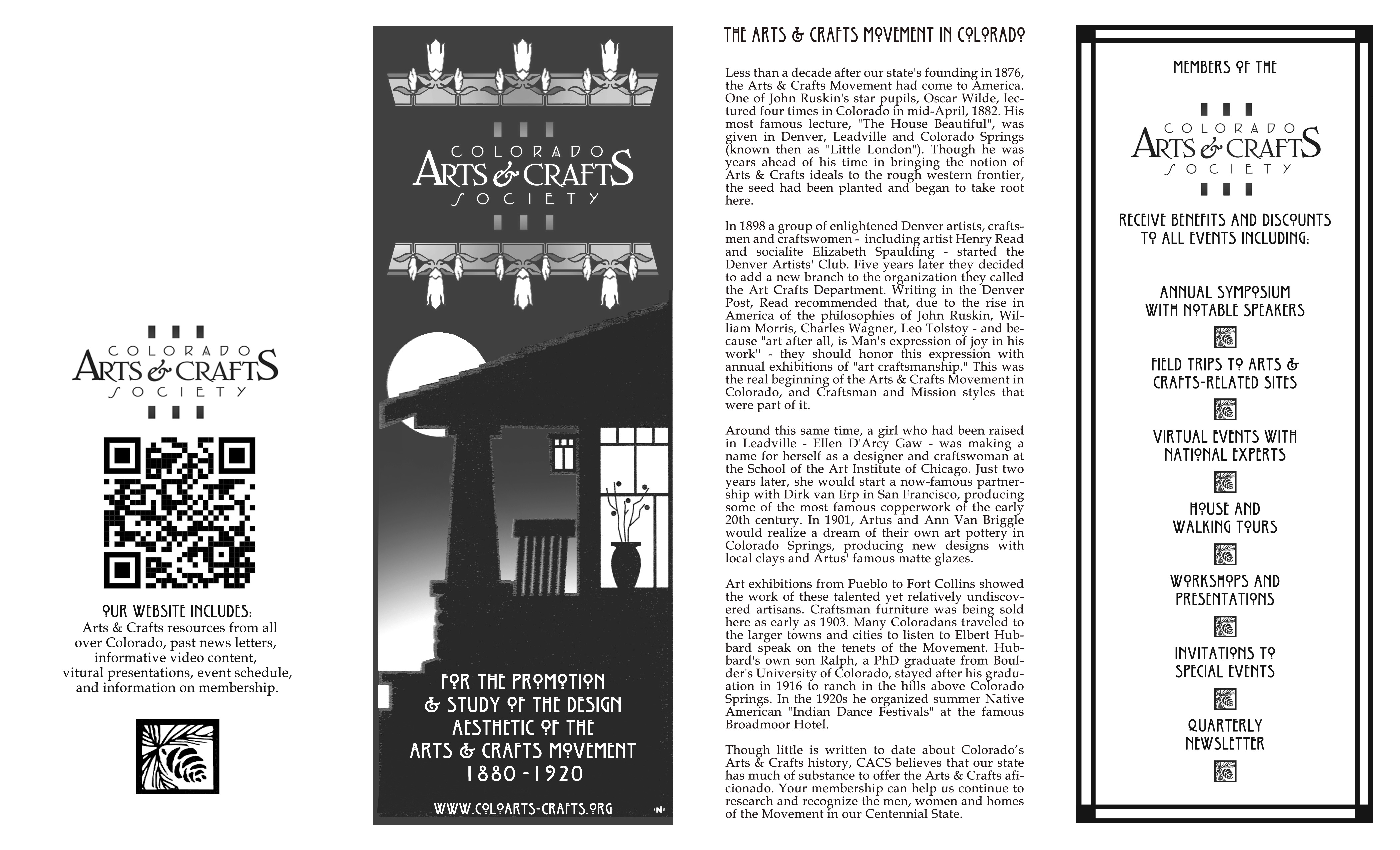 The Colorado Arts and Crafts Society (CACS) is a non-profit (501.C.3) volunteer organization dedicated to the study of the Arts and Crafts Movement in Colorado (c.1895-1920) through meetings and events such as lectures, tours and other educational programs that enhance awareness of this rich cultural heritage and stimulate interest in its preservation. We celebrated our 25th anniversary in 2022. To learn more, please check out our print brochure front & back.